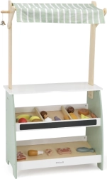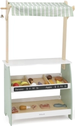De houten stand biedt voldoende ruimte voor verschillende soorten speelgoed, waardoor het perfect is voor winkel- of groentemarktspellen.