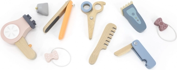 Dankzij verschillende houten tools zoals een schaar, kam en föhn biedt deze set alles wat nodig is voor creatief rollenspel als kapper.