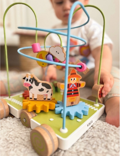Dit creatieve houten speelgoed op wieltjes biedt kinderen eindeloze ontdekkingsmogelijkheden. Op de stevige basis vind je figuren van een boer, een koe en een hond, een kleurrijke motorische lus met kralen, een zonnetje en een vlinder, plus draaibare tandwielen. De dieren zijn eenvoudig te wisselen en te verplaatsen, zodat kinderen hun eigen verhaaltjes maken en hun fijne motoriek oefenen.
