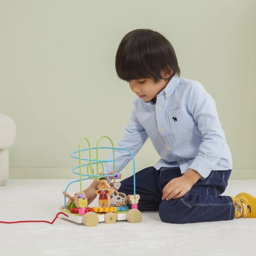 Het VIGA houten treklabyrint met boerderijthema combineert 2-in-1 – een kralenlabyrint en een trekspeelgoed met tandwielen en verwisselbare dieren. Het ontwikkelt fijne en grove motoriek, oog-handcoördinatie en motiveert kinderen om te lopen; gemaakt van hoogwaardig hout en voorzien van niet-giftige verven.