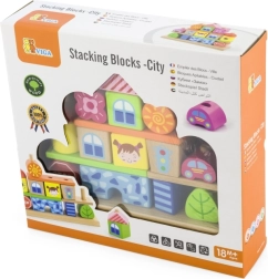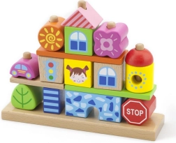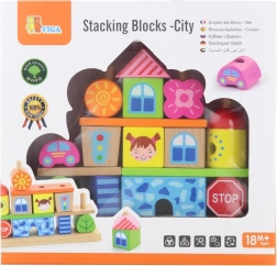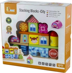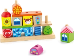 Bouw huisjes, straten en verkeersborden en verzin je eigen stadsverhalen. De blokken zijn vrij te combineren op de houten basis met staafjes.