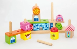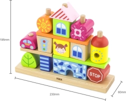 Deze speelse set tovert de kinderkamer om tot een kleine stad van houten blokken. Bevat 8 staafjes voor stabiel rijgen, 4 sjablonen ter inspiratie en 14 verschillende blokken met motieven van huisjes, bomen en verkeersborden. Kinderen kunnen bouwen volgens voorbeelden of eigen composities maken en zo verbeelding en logisch denken ontwikkelen.