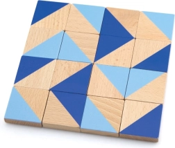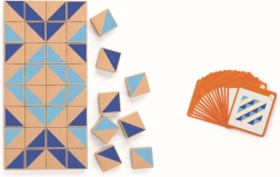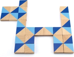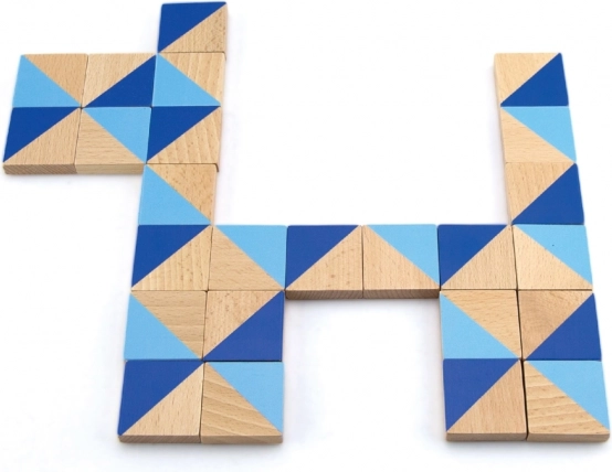 Veel verschillende geometrische stukjes in blauwe tinten en natuurlijk hout maken het mogelijk eindeloos veel figuren en patronen te leggen.