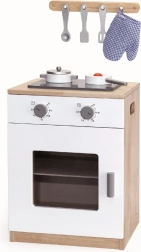 Stijlvol houten fornuis met oven en uitgebreide accessoires voor creatief speelplezier. Kinderen genieten van realistisch koken dankzij draaiknoppen, een ophangrail en transparante ovendeur. Inclusief pan met deksel, koekenpan, ovenwant en andere accessoires. Ideaal voor het ontwikkelen van fantasie, fijne motoriek en sociale vaardigheden. Veilig hout, realistische details, compacte afmetingen en plezier voor kinderen vanaf 3 jaar.