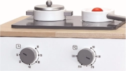 Twee kookplaten, draaiknoppen en een oven met transparante deur stimuleren kinderen tot creatief spel en prikkelen hun fantasie.