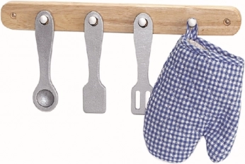 In de verpakking: pan met deksel, koekenpan, ovenwant en hangend keukengerei – kinderen kunnen meteen na het uitpakken “koken”.