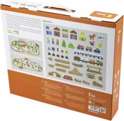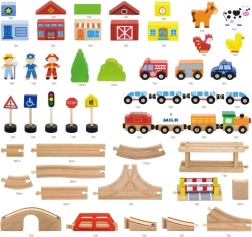 Ontdek het plezier van creatief bouwen met deze houten treinbaan met 90 delen, met rijk accessoirespakket, kleurrijke elementen en eindeloze baanconfiguraties. In de set vind je sporen, een brug, slagbomen, 2 treinen, autootjes, figuurtjes, dieren en andere accessoires voor fantasierijk spel en ontwikkeling van de fijne motoriek. Ideaal voor kinderen vanaf 3 jaar.