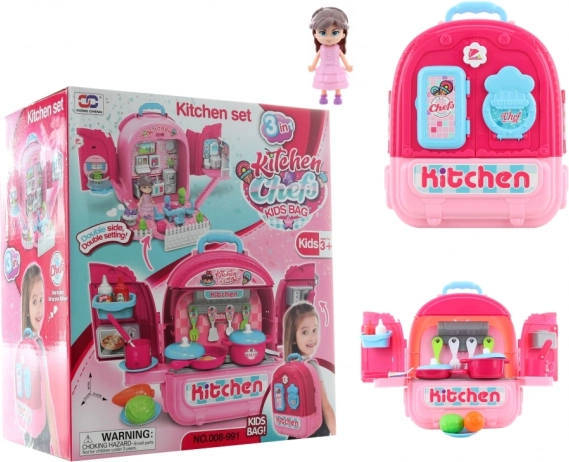 Prachtige 3-in-1 serviesset in rugzak voor kinderen: als keukenset, met pop of als praktische rugzak. Leeftijd 3+. Afmetingen 50,6 x 35,4 x 30 cm.