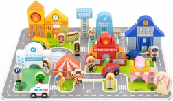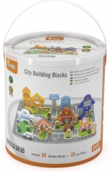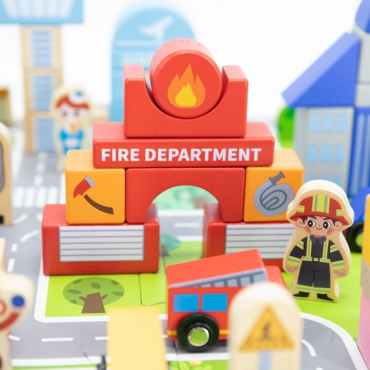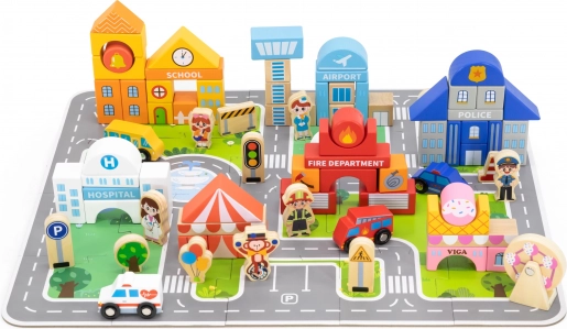 Deze hoogwaardige houten bouwset biedt kinderen een complete stad op één speeloppervlak. Met de 20 puzzeldelen leggen ze eerst wegen en pleinen, daarna bouwen ze met 60 kleurrijke blokjes de gebouwen. Voertuigen, figuren van verschillende beroepen en accessoires zoals bomen en verkeersborden zorgen voor nog realistischer spel.