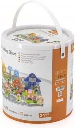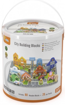 Ontdek de creatieve wereld met de houten bouwset Stad van Viga – een kleurrijke set met 80 onderdelen, inclusief een puzzelondergrond van 20 delen, 60 houten bouwblokjes, voertuigen en figuren. Kinderen bouwen een school, ziekenhuis, politie, brandweer, luchthaven, banketbakkerij en circus en oefenen zo hun fijne motoriek, creativiteit en fantasie. De praktische emmer met handvat maakt opbergen en meenemen gemakkelijk.