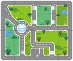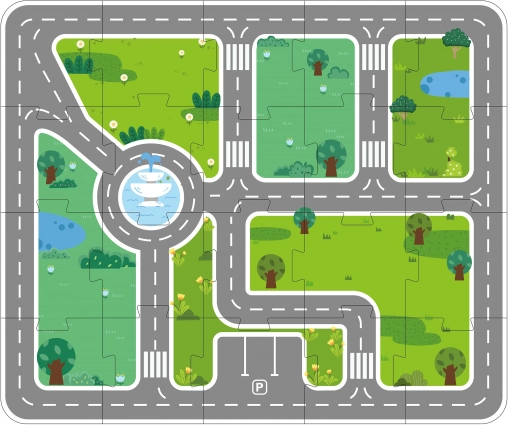De ondergrond uit 20 delen met wegen en parkeervakken creëert een overzichtelijke omgeving voor alle gebouwen en voertuigen. Kinderen oefenen ruimtelijke oriëntatie en verkeersregels.