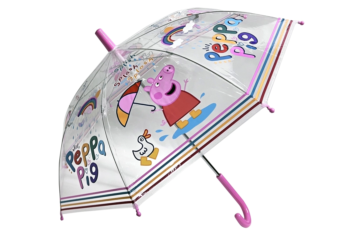 Handmatige paraplu met het motief van het populaire personage Peppa. Afmetingen van de geopende paraplu ca. 65 x 65 x 60 cm. Afmetingen van de verpakking ca. 60 x 8,5 x 4 cm. Verpakt in een plastic zak.