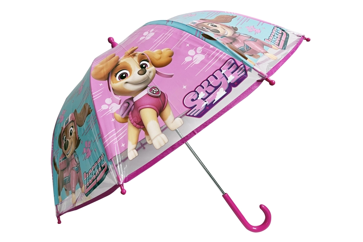 Uitschuifbare paraplu met Paw Patrol-motieven. Afmetingen van de uitgeklapte paraplu ca. 73 x 73 x 63 cm. Afmetingen van de verpakking ca. 64 x 7,5 x 4 cm. Verpakt in een plastic zak.