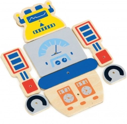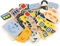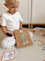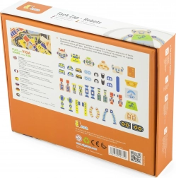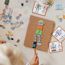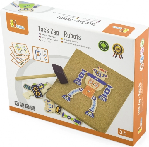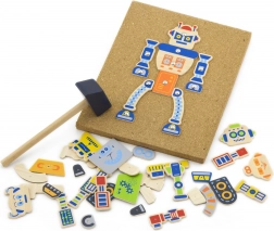 Ontdek een leuke en educatieve set voor kleine bouwers – het houten hamerbord van VIGA met het thema robots. De set bevat 45 kleurrijke houten onderdelen, een kurken bord, een houten hamertje, speldjes en kaarten met voorbeelden. Kinderen ontwikkelen fijne motoriek, logisch denken, concentratie en creativiteit terwijl ze vormen op het bord vastzetten volgens hun fantasie of aan de hand van patronen.