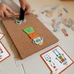 Kaarten met 10 patronen helpen om te starten, maar de echte pret begint bij vrij ontwerpen. Kinderen stellen hun eigen robots samen en oefenen verbeeldingskracht en planning.