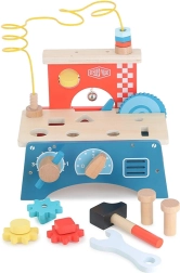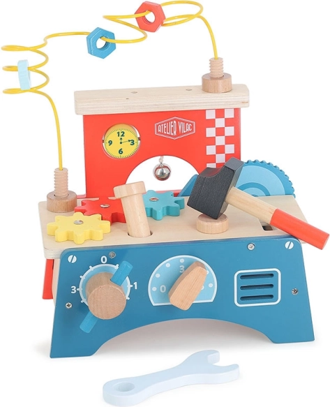 De multi-activiteitentafel van het merk Vilac is ontworpen om de ontwikkeling van kinderen op verschillende gebieden te ondersteunen. Het bevat een hamer, bel, tandwielen en vele andere elementen voor de ontwikkeling van zintuigen en motorische vaardigheden. Speelgoed geïnspireerd door de Montessori methode bevordert de natuurlijke ontwikkeling van het kind, benadrukt onafhankelijkheid en ontdekken. Kinderen leren samen spelen, wat helpt bij de ontwikkeling van hun sociale vaardigheden.