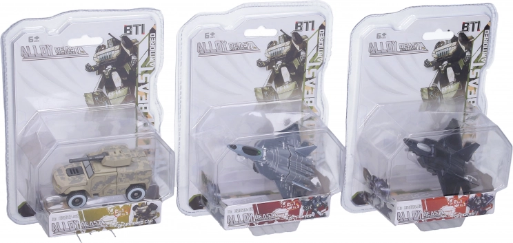 Metalen autorobot 11 cm in 4 varianten: lichte straaljager, donkere straaljager, tank en militair voertuig. Duurzaam metalen speelgoed, ideaal voor actiespel en verzamelaars.