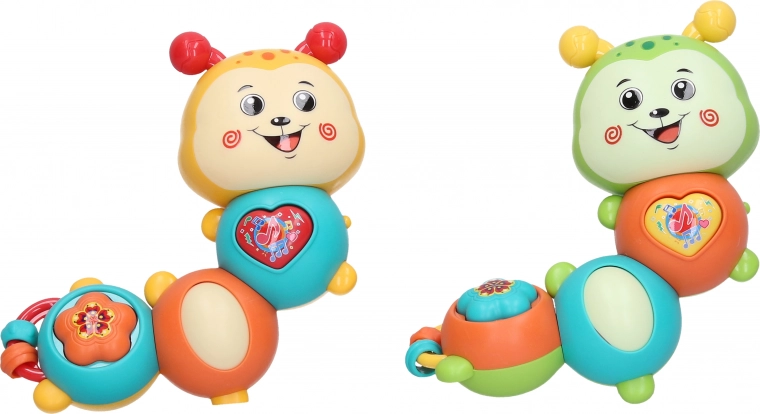 Aantrekkelijke rammelaar in de vorm van een rups van 14 cm met licht- en geluidseffecten, inclusief melodieën die elk kind zullen boeien.