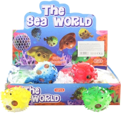 Anti-stress knijpballetje in de vorm van een kogelvis, waaruit massa naar buiten komt bij het knijpen. Afmeting ca. 9×5×6 cm. Verpakt in een zakje. Leeftijd 3+