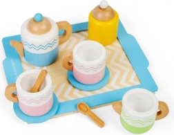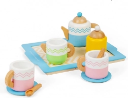 Deze uitgebreide theeset biedt alles wat kleine gastheer of gastvrouw nodig heeft – van kopjes tot en met theepot en dienblad. De hoogwaardige houten uitvoering, gladde afwerking en zachte pasteltinten nodigen uit tot spel dat verbeelding, communicatie en basisregels van tafelen ontwikkelt.
