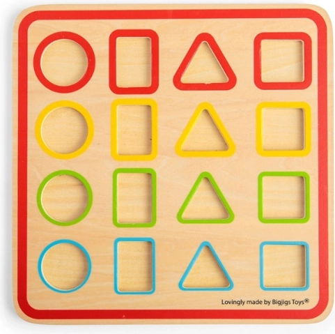 De set bevat een stevig basisbord en 16 houten stukjes in verschillende vormen en kleuren. Het compacte formaat van het bord 25 × 25 × 0,9 cm is geschikt voor de kindertafel en voor onderweg, en is eenvoudig op te bergen.