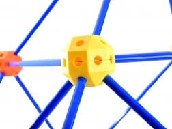 Blauwe staven en veelhoekige koppelingen van hard kunststof behouden hun vorm en zorgen voor stabiliteit, ook bij grotere projecten.
