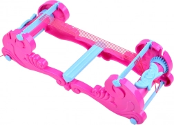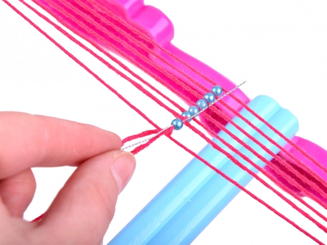 Het roze-blauwe weefraam houdt de draden stevig op hun plek en maakt comfortabel rijgen van kralen en regelmatige patronen mogelijk.
