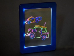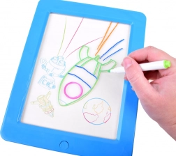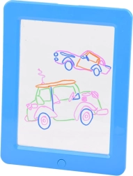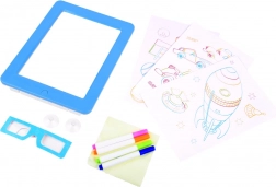 De lichtgevende tablet is een geweldig hulpmiddel voor de ontwikkeling van fantasie, creativiteit en fijne motoriek. Kinderen kunnen eigen motieven tekenen of eenvoudig voorbeelden overtrekken van de meegeleverde kaartjes en ze vervolgens in het frame met LED-verlichting plaatsen. Met de 3D-bril krijgen hun creaties een ruimtelijk effect dat hen zal verrassen.