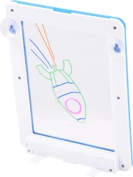 De tablet is licht, draagbaar en ideaal voor thuis knutselen, spelen en als decoratie voor de kinderkamer. Neonstiften in felle kleuren (groen, blauw, oranje, roze) zorgen voor duidelijke lijnen; met het doekje wis je snel en kun je opnieuw tekenen. Zuignappen helpen de tablet eenvoudig op een glad oppervlak te bevestigen.
