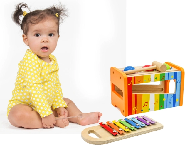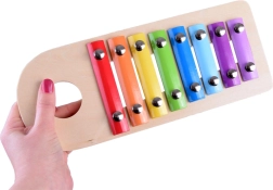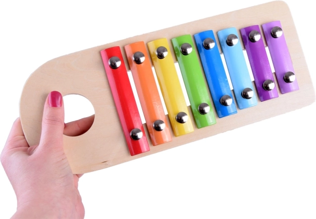 De houten xylofoon en het hamertje ondersteunen niet alleen muzikale, maar ook motorische vaardigheden van kinderen.