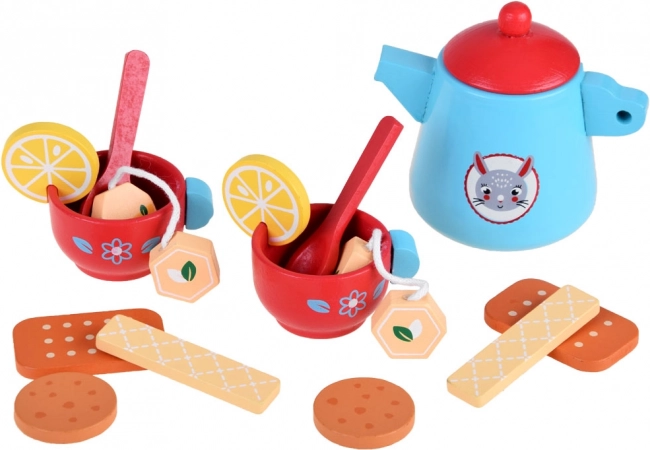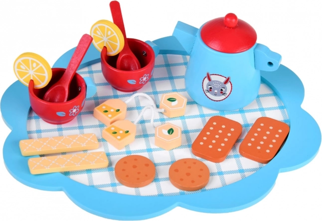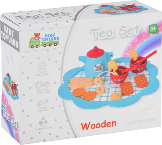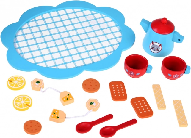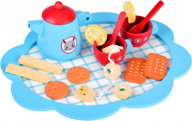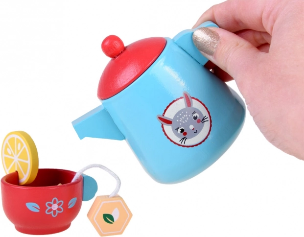 Schattige houten theeset voor kinderen in blauwe tinten met alles voor een mini-theefeestje: dienblad, theepot, kopjes, lepeltjes, koekjes en citroen. Gemaakt van duurzaam hout en afgewerkt met veilige, niet-giftige verven, ideaal voor rollenspel, fantasieontwikkeling en fijne motoriek voor kinderen vanaf 3 jaar.