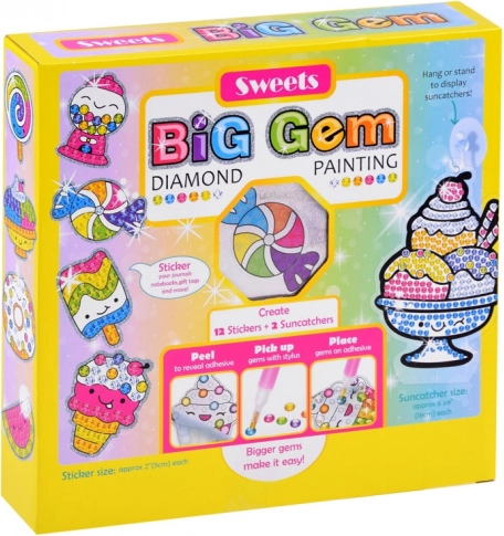 Creëer sprankelende afbeeldingen en stickers met snoepthema met behulp van grotere “diamanten” die gemakkelijk met de applicator kunnen worden opgepakt en precies op de zelfklevende sjablonen worden geplaatst. Kinderen oefenen spelenderwijs de oog-handcoördinatie, concentratie en esthetisch gevoel – met als resultaat prachtige decoraties voor raam, spiegel, schrift of plank.