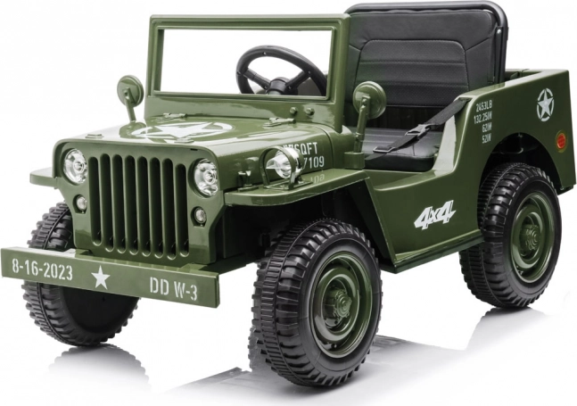 Stijlvolle kinderjeep geïnspireerd op de legendarische Willys, voor volop plezier in de tuin en in het park. Voorzien van 4 sterke 12 V-motoren, een 12 V 7 Ah gelaccu en bediening via een 2,4 GHz afstandsbediening voor ouders. Voor comfort en veiligheid zijn er een lederen zitting, veiligheidsgordels, EVA-wielen, voorste LED-verlichting en een muziekpaneel met motorgeluiden en claxon.