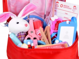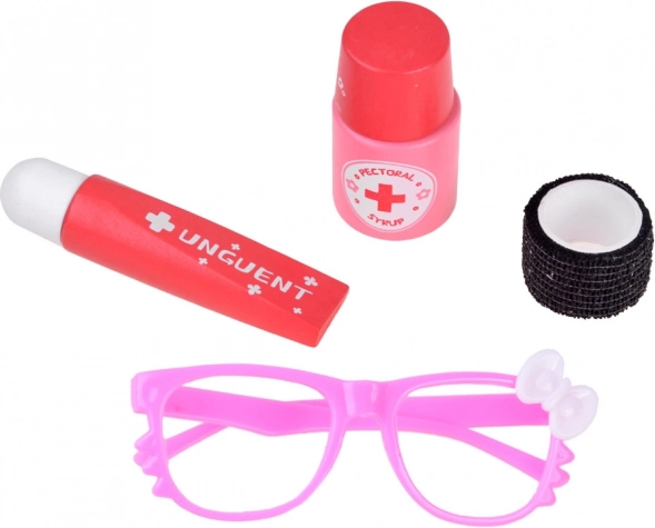 Let op: alle onderdelen zijn rekwisieten. Stop geen “medicijnen” of andere kleine onderdelen in de mond tijdens het spelen. Kleur/patroon van het pluchen konijntje kan variëren.