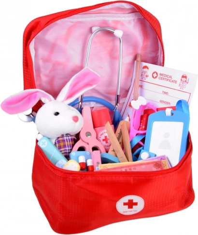 Inclusief thermo-element/thermometer met verwisselbare schijven, spuit, schaar, pincet, verband, pleisters, “medicijnen” in tablet- en capsulevorm (rekwisieten), siroop en zalf in een tube, patiëntenkaarten en een artsenpas. Alles berg je eenvoudig op in de stevige rode EHBO-tas met handvat, waardoor de set ideaal is voor onderweg en snelle ingrepen.