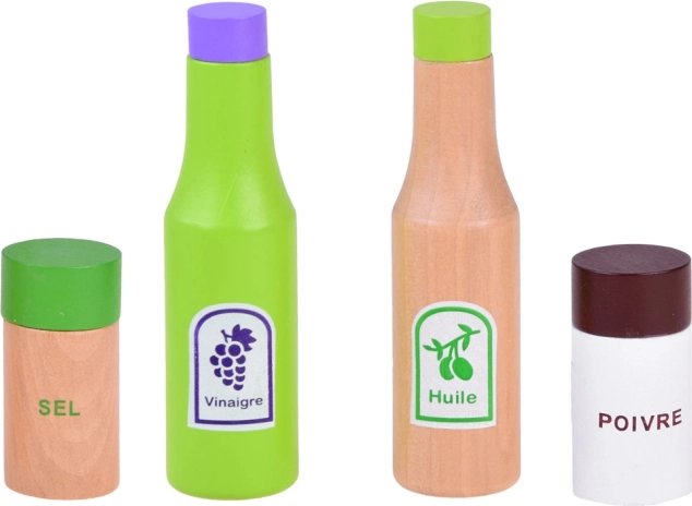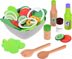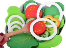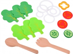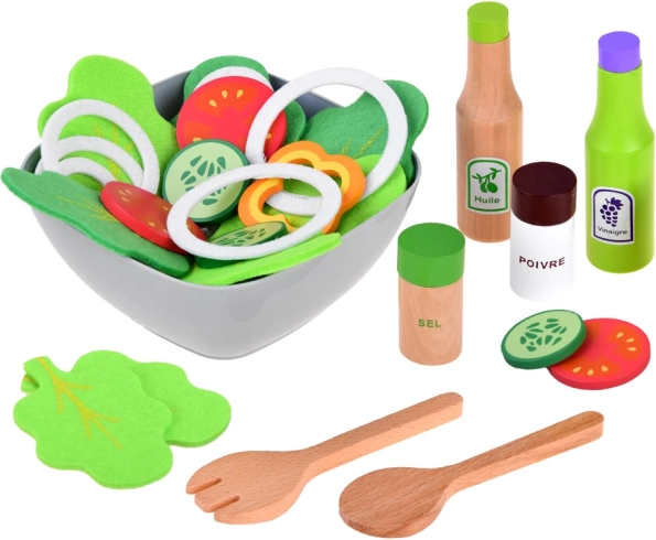 Vilten groenteschijfjes, houten kruidenflesjes en serveerlepels laten kinderen een “echte” salade maken en prikkelen de fantasie tijdens het keukenspel.