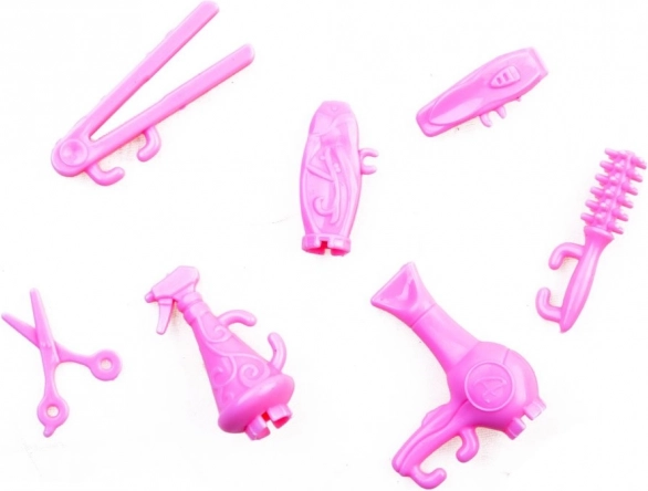 Föhn, schaar, spray, kammen en andere plastic accessoires stimuleren rollenspel in de schoonheidssalon en ontwikkelen verbeelding en motoriek.