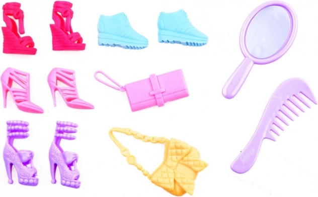 Verschillende soorten schoenen, handtassen, een spiegeltje en een kam maken elke look tot in de puntjes af en benadrukken de persoonlijke stijl van de pop.