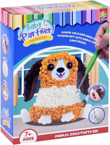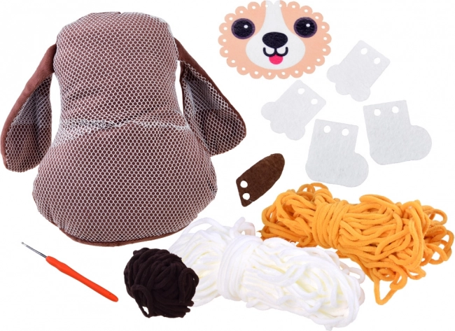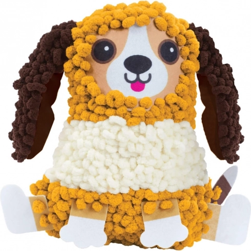 Creatief kussentje in de vorm van een hondje voor kinderen die graag knutselen zonder naald en draad. Zacht, pluizig en veilig project, waarbij je met de meegeleverde haak eenvoudig garen door een gaaszakje haalt en zo een harige vacht creëert. Het afgewerkte kussentje wordt een prachtige decoratie en een knuffelig kussen-speeltje voor de kinderkamer.
