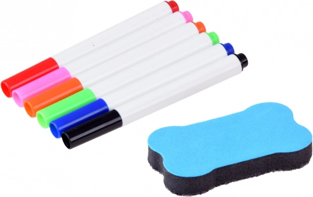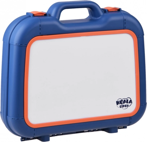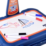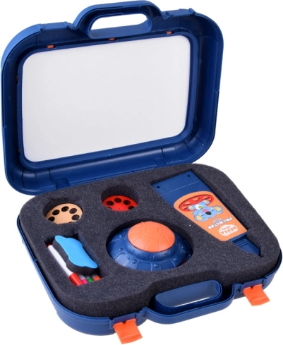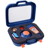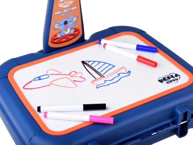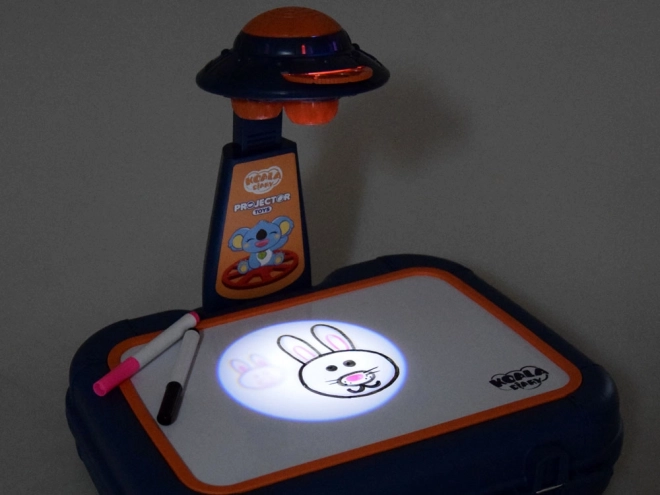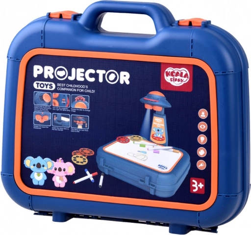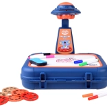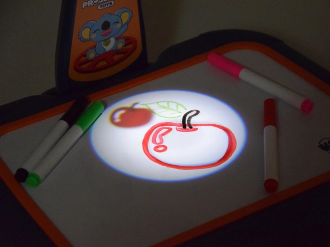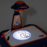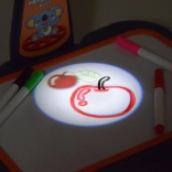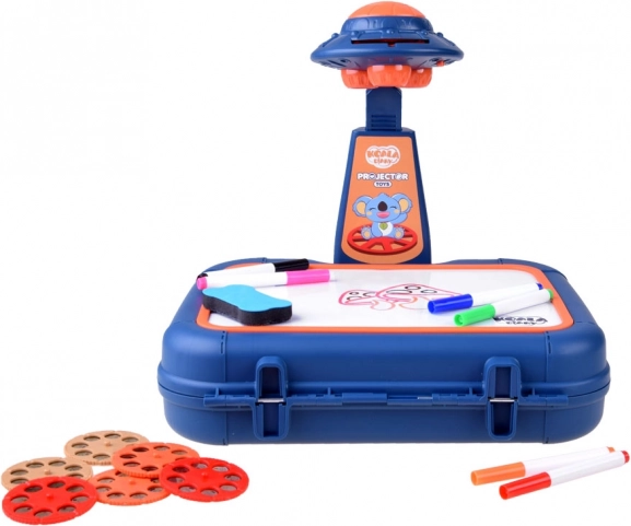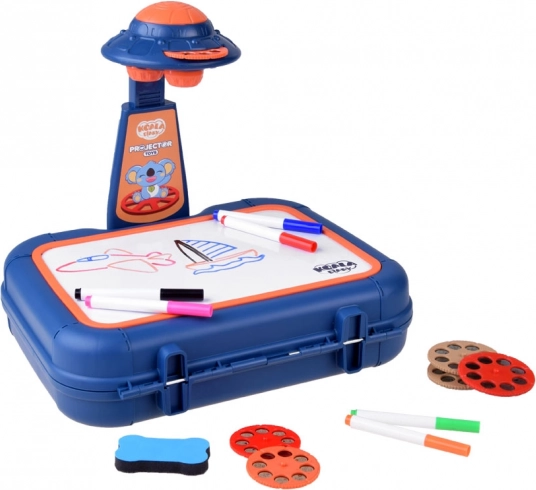 Koffertje met tekenoppervlak, projector-lampje, verstelbare arm, 6 sjablonen met afbeeldingen, uitwis-spons en 6 stiften.
