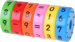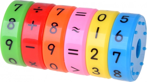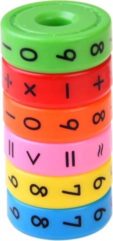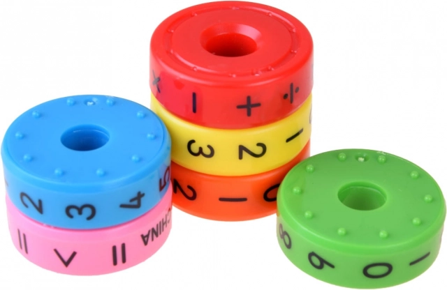 Zes kleurrijke magnetische ringen stellen kinderen in staat verschillende wiskundige operaties uit te voeren.