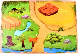 De speelmat bevat verschillende terreinen zoals gras, een pad en een vijver, die de speelervaringen van kinderen verrijken.
