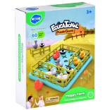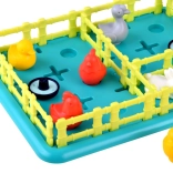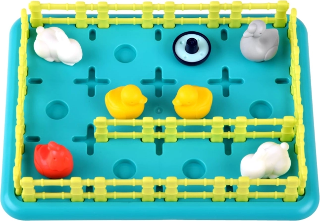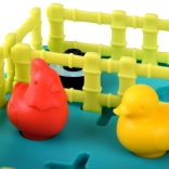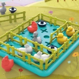 De inhoud van de doos omvat een speelbord, verschillende plastic hekken, dierfiguren zoals konijnen, eenden en ganzen, en een instructieboekje. De materialen zijn van hoge kwaliteit, kleurrijk en aangenaam om aan te raken.