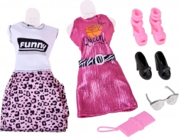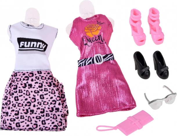 De set bevat verschillende soorten kleding en accessoires, zoals een jurk met luipaardprint en stijlvolle handtasjes.