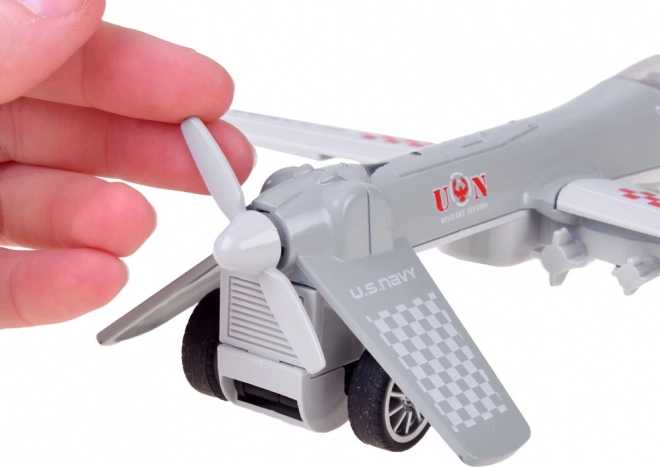 Het model is gemaakt van metaal en kunststof met inklapbare vleugels en een werkende propeller, waarbij elk detail zorgvuldig is afgewerkt.