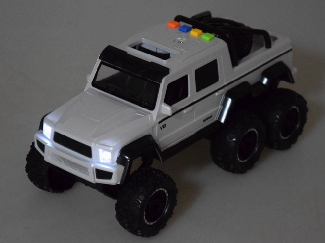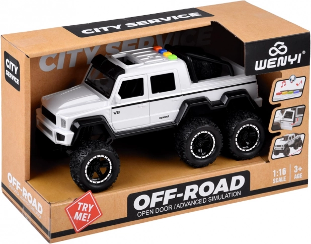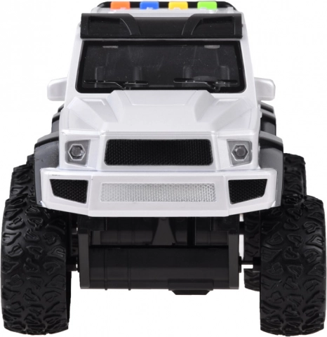 Zeswielige terreinwagen voor kinderen met friction power-mechanisme zorgt voor vlotte ritjes over een vlakke ondergrond. Biedt licht- en geluidseffecten bediend met 4 knoppen op het dak, openende deuren en een duurzame kunststof constructie met grote banden die vriendelijk zijn voor de vloer. Ideaal speelgoed voor kinderen vanaf 3 jaar, afmetingen ca. 25,5 × 12,5 × 12 cm.