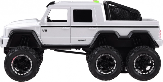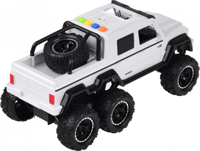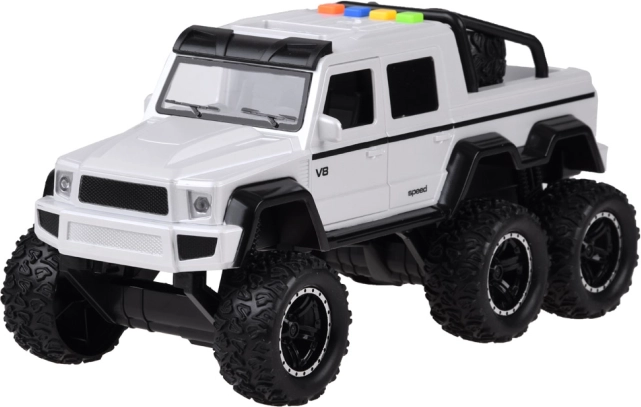 Ontdek offroad-plezier met de zeswielige pickup die obstakels de baas is en dankzij de grote profielbanden ook vriendelijk is voor de vloer thuis. De robuuste kunststof carrosserie in parelmoerwit en de gedetailleerde afwerking prikkelen de fantasie en nodigen uit tot avontuurlijk spel.