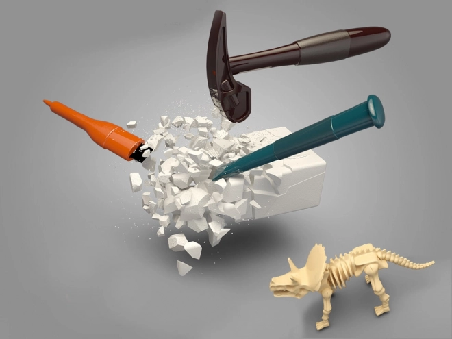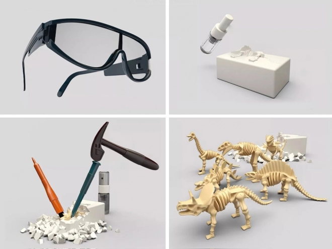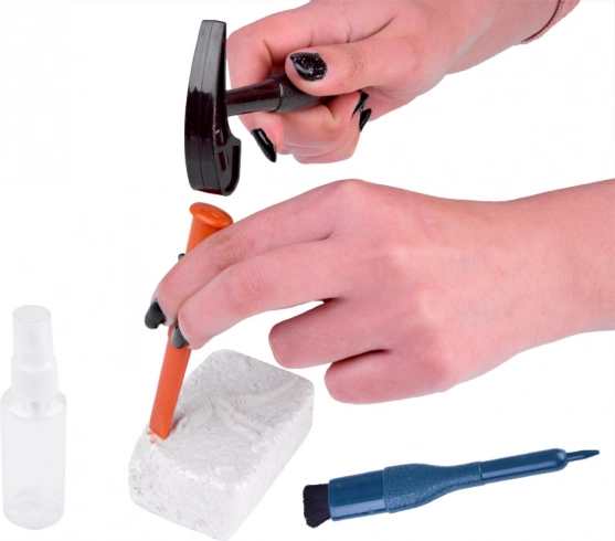 De set is ideaal als creatief en educatief cadeau voor nieuwsgierige kinderen. De werkwijze is eenvoudig: bevochtigen, voorzichtig met beitel en hamertje blootleggen, stof wegvegen met de kwast en tot slot het skelet monteren. Het resultaat is een kleine thuiskollectie van zes dinosaurusmodellen.
