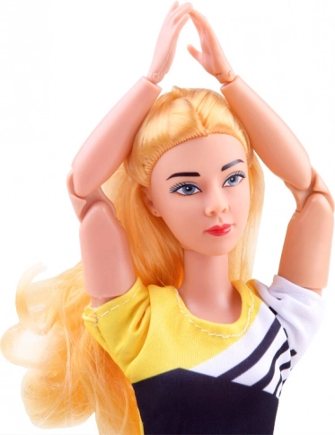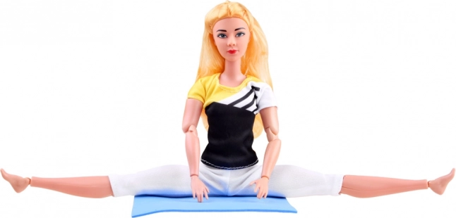 De flexibele pop met lang blond haar draagt een sportset met elastische legging en top, zodat ze comfortabel kan trainen. De gewrichtsconstructie maakt realistische posities van armen, benen en romp mogelijk, waardoor favoriete asana’s en gymnastiekhoudingen eenvoudig kunnen worden nagebootst.