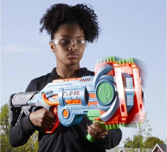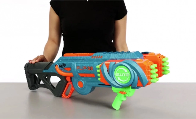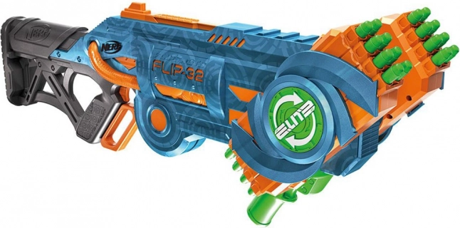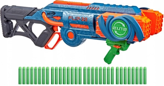 De Nerf Elite 2.0 Flip-32 Blaster is gemaakt van hoogwaardig plastic en de kogels zijn van veilig foam met rubberen uiteinden. Het systeem van draaibare magazijnen biedt flexibiliteit en voortzetting van het spel zelfs na het afvuren van de eerste lading kogels. Gewoon het magazijn 180 graden draaien en het plezier kan doorgaan. Twee schietopties bieden ofwel singeledig schot of dubbel schot.